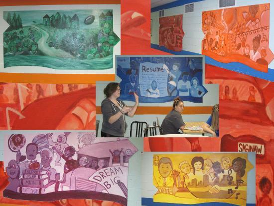 This event culminated in the dedication of a mural in six panels by SVSU students Marissa Kemp, Tianna Lazaruk, Tylar Greer-Travis, Malory Kochanny, Samantha Rieger, in Professor Mike Mosher’s Art 433 Community Murals class, with input from the students of Professors Joseph Ofori-Dankwa, Dawn Hinton and David Rzeszutek, as well as First Ward Saginaw Youth who visited the University.